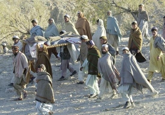 這是2001年12月19日,阿富汗托拉博拉地區(qū)的一群村民為一個被集束炸彈炸死的22歲年輕人送葬。這名年輕人在撿柴火的時候被一枚集束炸彈炸死。新華社發(fā)