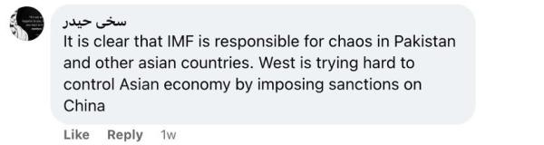 還有網(wǎng)友留言說:“國際貨幣基金組織對巴基斯坦和其他亞洲國家的混亂負(fù)有責(zé)任,這一點(diǎn)再清楚不過了。西方試圖通過制裁中國來控制亞洲經(jīng)濟(jì)?!?/p>