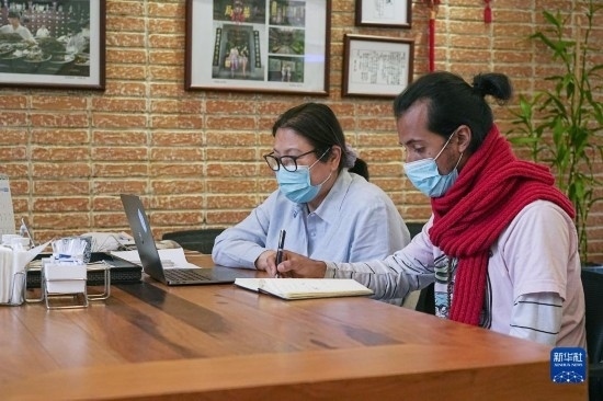 7月27日,在巴西圣保羅,中巴中醫(yī)藥國際合作中心負(fù)責(zé)人方芳(左)與同事參加視頻會(huì)議。新華社發(fā)(保羅·洛佩斯 攝)