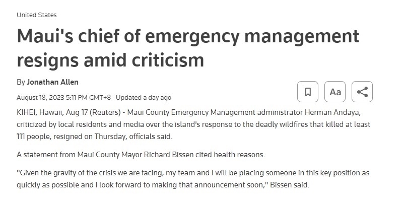 路透社8月18日報道,毛伊縣緊急事務管理機構(gòu)負責人赫爾曼·安達亞在當?shù)鼐用窈兔襟w的一片“救災不利”的譴責聲中辭職。截至17日,致命山火已經(jīng)造成至少111人死亡。一些毛伊島居民認為,如果能更早拉響警報,會挽救更多生命。