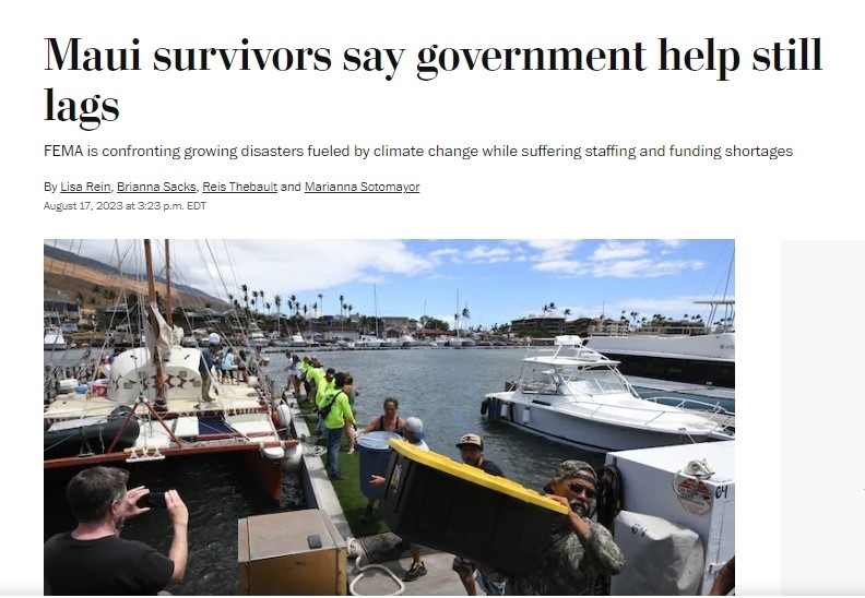 《華盛頓郵報》8月17日發(fā)表報道批評稱,政府救援仍然滯后,一些毛伊島幸存者仍在艱難地尋求住所和日常生活必需品。