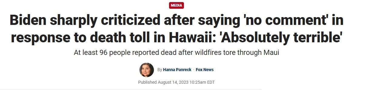 ??怂剐侣劸W(wǎng)8月14日報道稱,當?shù)貢r間13日上午,毛伊島救災仍在進行,美國總統(tǒng)拜登卻在其位于特拉華州里霍伯斯海灘的海邊別墅過周末。當被問及毛伊島大火造成的死亡人數(shù)正不斷上升的問題時,拜登表示“不予置評”。