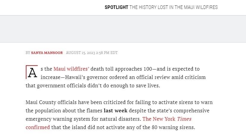 據(jù)悉,夏威夷毛伊島部署有80個警報器,但是在此次野火來襲過程中,警報器并未響起。安達亞16日曾表示,他并不后悔沒有拉響警報器,因為警報器通常是用來警示海嘯的,反而可能導致很多民眾逃向內(nèi)陸地勢較高處,從而進入火海。這一表態(tài)激起了廣泛爭議和批評。