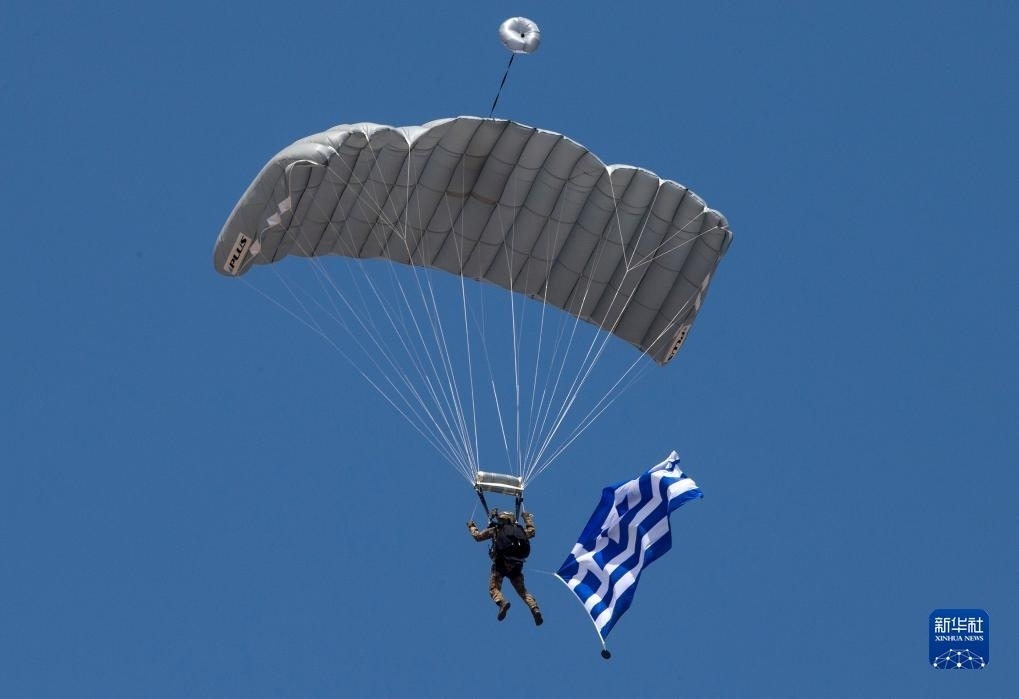 9月2日,在希臘塔納格拉空軍基地的雅典飛行周上,跳傘員在空中展示希臘國(guó)旗。新華社發(fā)(馬里奧斯·羅洛斯攝)