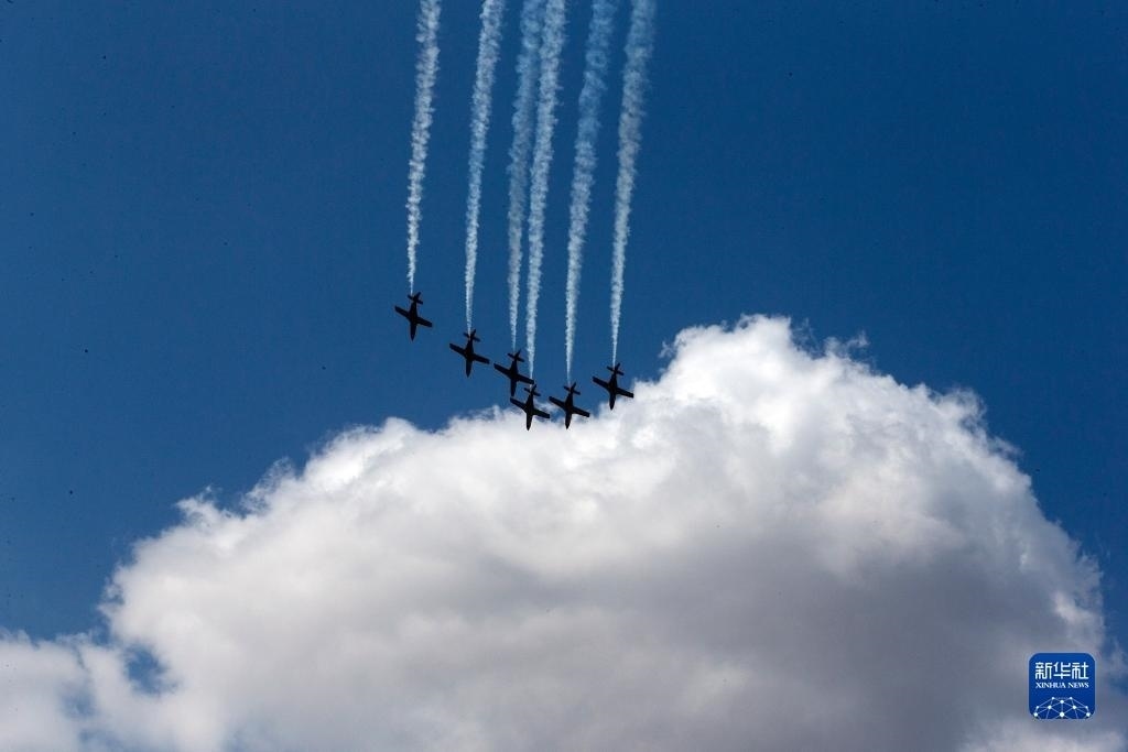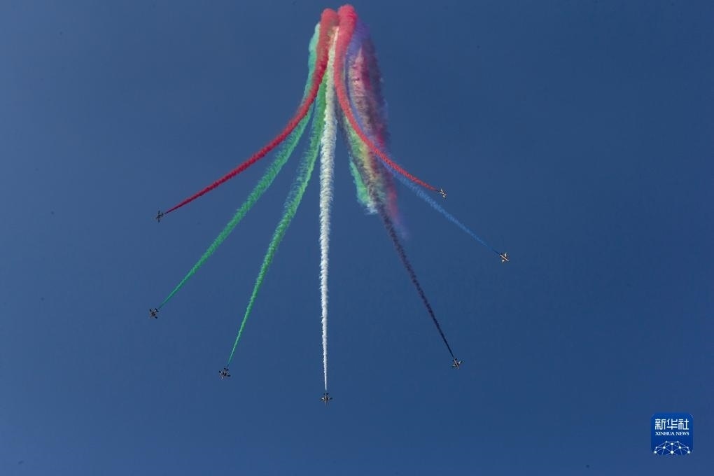9月2日,在希臘塔納格拉空軍基地的雅典飛行周上,來(lái)自阿聯(lián)酋的飛行表演隊(duì)進(jìn)行表演。新華社發(fā)(馬里奧斯·羅洛斯攝)