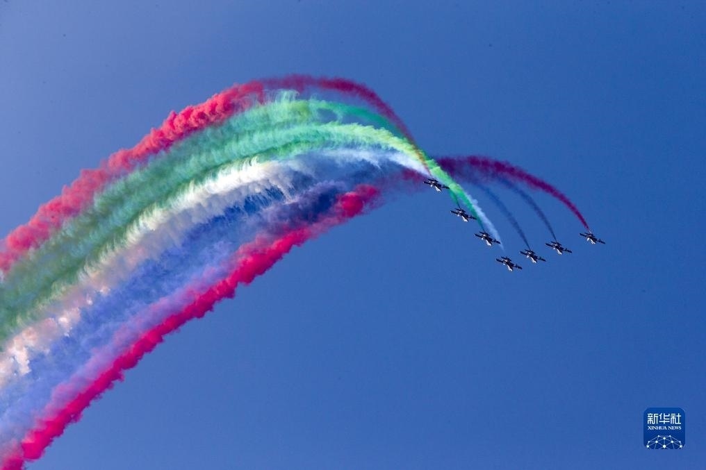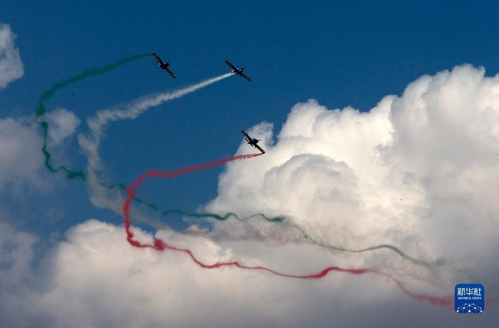 9月2日,在希臘塔納格拉空軍基地的雅典飛行周上,來(lái)自意大利的飛行表演隊(duì)進(jìn)行表演。新華社發(fā)(馬里奧斯·羅洛斯攝)