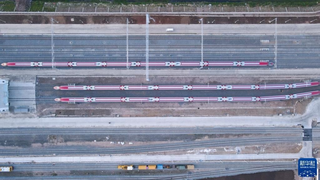 7月20日,雅萬(wàn)高鐵列車(chē)??吭谟《饶嵛鱽喨f(wàn)隆德卡魯爾動(dòng)車(chē)所附近(無(wú)人機(jī)照片)。新華社記者 徐欽 攝