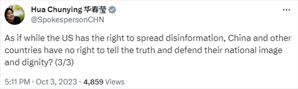 美國國務(wù)院上月28日炮制虛假報告,謊稱中國正斥資數(shù)十億美元在全球散布虛假信息。我外交部發(fā)言人華春瑩3日在X平臺對美方的謬論予以了駁斥。
