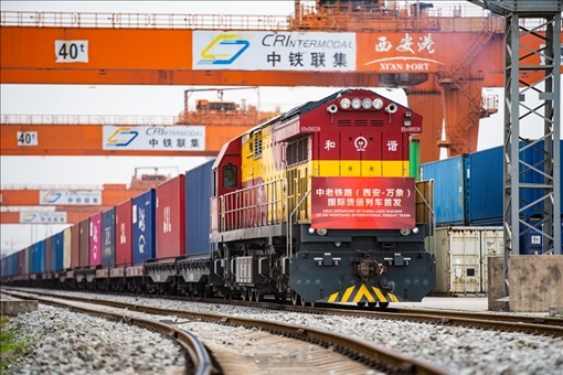 2022年4月22日,陜西西安首趟中老鐵路(西安至萬象)國際貨運列車從西安國際港站發(fā)車。新華社記者 劉翔 攝