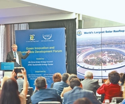 當(dāng)?shù)貢r(shí)間11月13日,由亞太經(jīng)合組織可持續(xù)能源中心和美中綠色能源促進(jìn)會共同主辦的“綠色創(chuàng)新與可持續(xù)發(fā)展論壇”在舊金山舉行,與會嘉賓就清潔能源、綠色發(fā)展、共同應(yīng)對氣候變化等議題交流研討。本報(bào)北美中心分社 伊芙莉·妮可·梅菲爾德攝