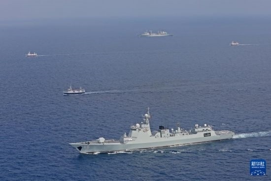 中國海軍第45批護(hù)航編隊(duì)烏魯木齊艦、東平湖艦為中國漁船護(hù)航(2023年10月20日攝)。新華社發(fā)(王遠(yuǎn)方攝)