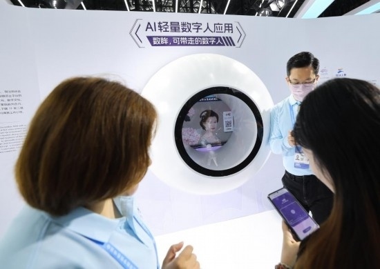 2023年11月23日,參觀者在第二屆全球數(shù)字貿(mào)易博覽會上體驗數(shù)字人應用。新華社記者徐昱攝