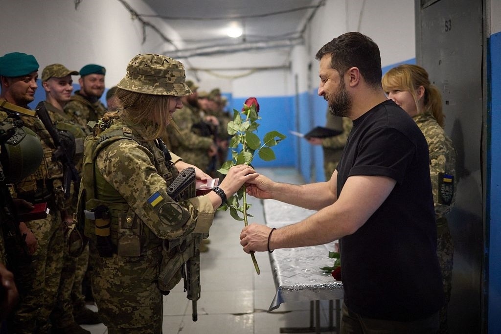 當(dāng)?shù)貢r間2023年9月4日,頓涅茨克地區(qū),烏克蘭總統(tǒng)弗拉基米爾·澤連斯基(右)在視察前線指揮所,并送女兵玫瑰花。