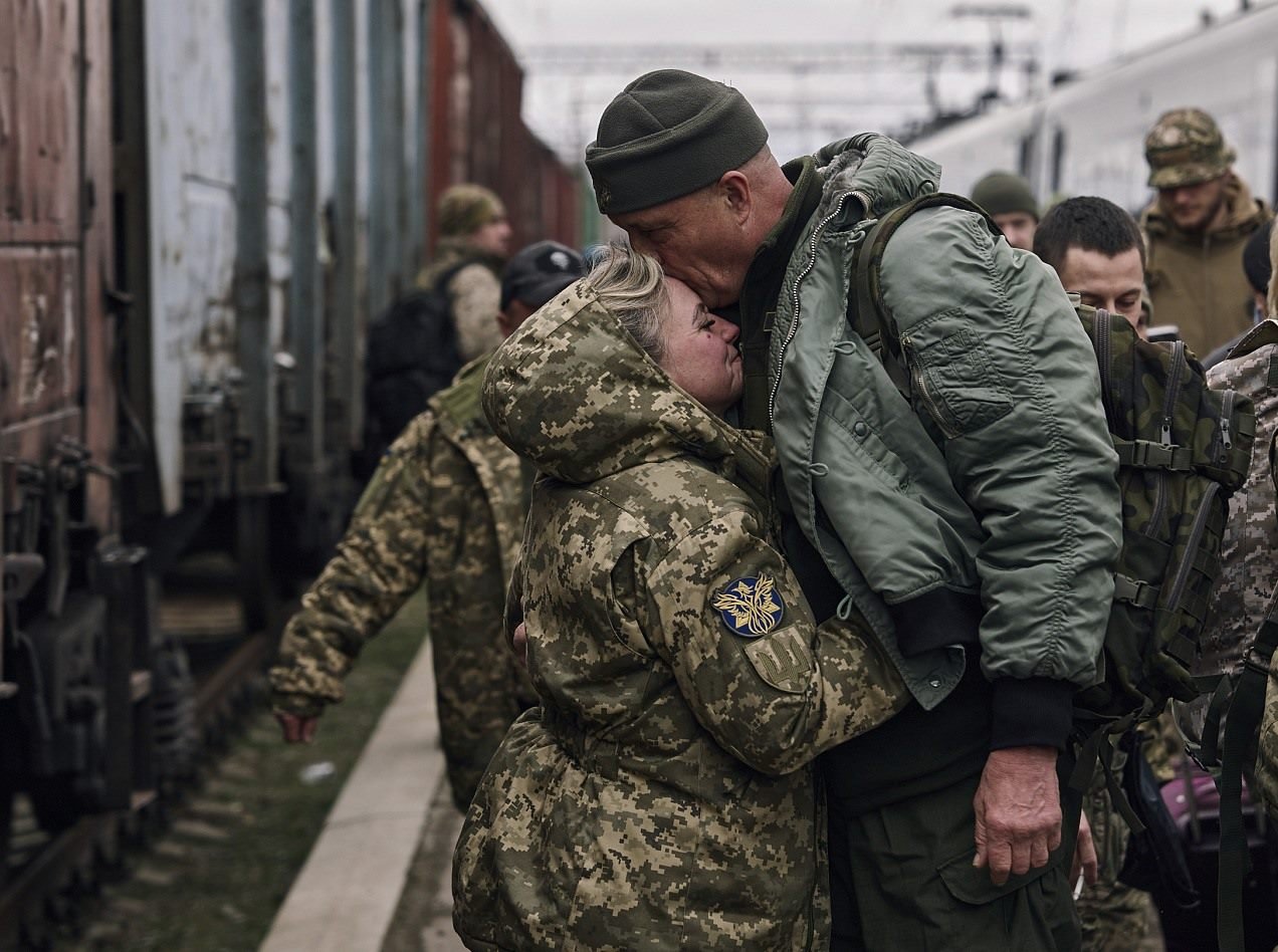 當(dāng)?shù)貢r間2023年3月29日,頓涅茨克地區(qū)克拉馬托爾斯克,一名即將去前線的烏克蘭女兵在火車站與丈夫分別。