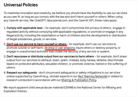 然而,在1月10日對其使用條款進(jìn)行一番大更新后,OpenAI公司雖然在禁止項(xiàng)中仍然提到禁止將其產(chǎn)品、模型和服務(wù)用于會導(dǎo)致人員傷亡的用途上,并提到了“武器開發(fā)和使用”,但先前同樣被禁止的軍事用途,如今卻在文本中消失了。