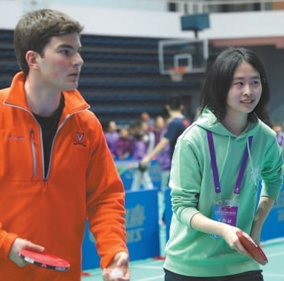 1月6日上午,清華大學(xué)綜合體育館內(nèi),加油聲此起彼伏。來自弗吉尼亞大學(xué)和清華大學(xué)的學(xué)生聯(lián)合組隊,進(jìn)行多輪次乒乓球混合雙打比賽。小小的乒乓球來回穿梭,兩國青年通力配合,贏得陣陣掌聲。