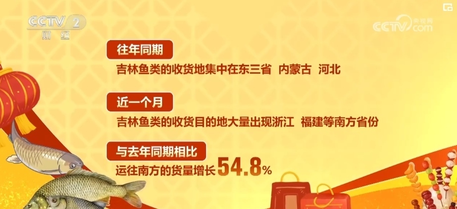 南方水果運(yùn)往北方的同時(shí),北方的堅(jiān)果、水產(chǎn)和鮮奶運(yùn)送到了南方。從訂單數(shù)據(jù)看,吉林魚(yú)類(lèi)的收貨地在往年都集中在東三省、內(nèi)蒙古、河北。然而在最近一個(gè)月,收貨的目的地大量出現(xiàn)了浙江、福建等南方省份,跟2023年同期相比,運(yùn)往南方的貨量增長(zhǎng)了54.8%。