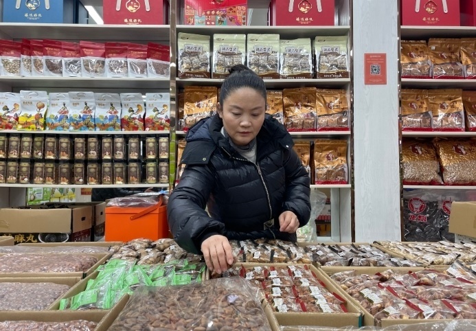 這是湖南長沙高橋大市場堅(jiān)果經(jīng)銷商李海麗在整理貨物。新華社記者 余春生 攝