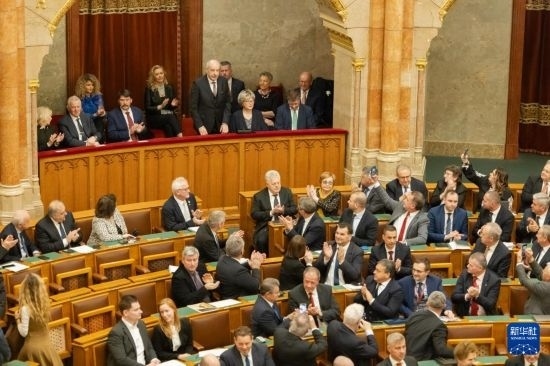 2月26日,在匈牙利布達佩斯,匈牙利當選總統(tǒng)舒尤克·道馬什(前中)接受祝賀。新華社發(fā)(弗爾季·奧蒂洛攝)