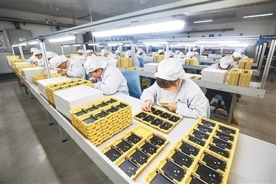 山東省榮成市港西鎮(zhèn)一家外資電子制造企業(yè)的工人們在電子智能設備生產(chǎn)線上忙碌著,趕制出口國外的訂單產(chǎn)品。