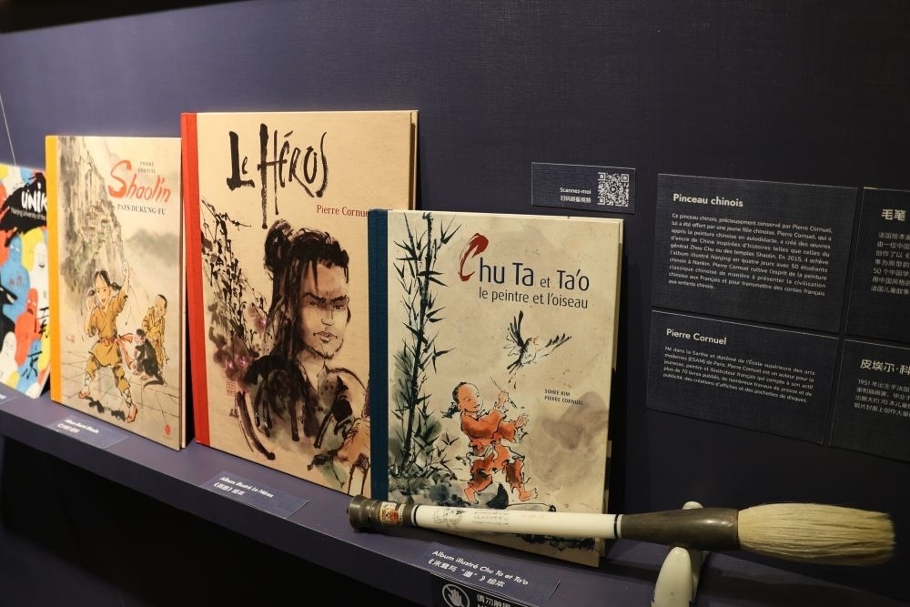 這是3月23日在“甲子情深——中法百姓故事展”上拍攝的法國(guó)畫家皮埃爾·科尼埃爾創(chuàng)作的“中國(guó)風(fēng)”法語(yǔ)繪本及其在中國(guó)訪問(wèn)期間獲贈(zèng)的毛筆。新華社記者張百慧攝