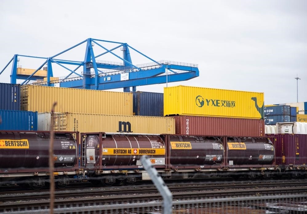 這是3月28日在德國(guó)杜伊斯堡一處貨運(yùn)場(chǎng)站拍攝的集裝箱。