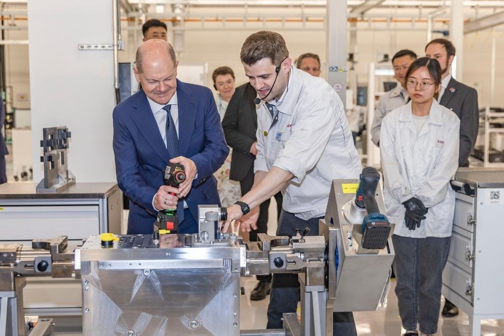 4月14日,德國(guó)總理朔爾茨在位于重慶市九龍坡區(qū)的博世氫動(dòng)力系統(tǒng)(重慶)有限公司參訪。