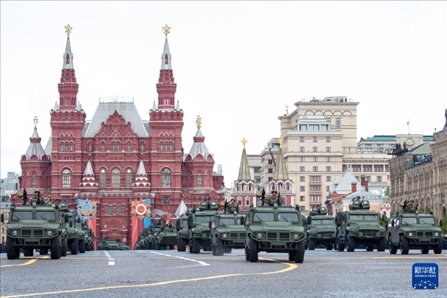 5月9日,在俄羅斯首都莫斯科,軍車(chē)編隊(duì)駛過(guò)紅場(chǎng)。新華社記者 曹陽(yáng) 攝