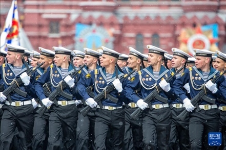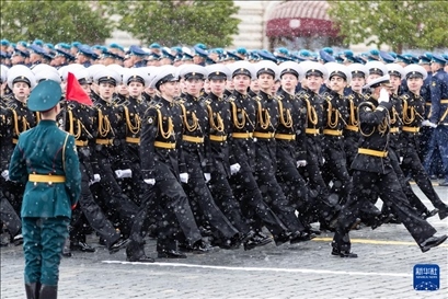 5月9日,在俄羅斯首都莫斯科,士兵列隊(duì)走過(guò)紅場(chǎng)。新華社記者 白雪騏 攝