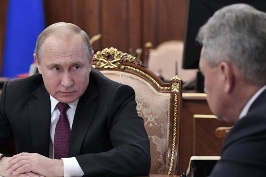 2019年2月2日,在俄羅斯莫斯科,俄羅斯總統(tǒng)普京(左)會(huì)晤國(guó)防部長(zhǎng)紹伊古和外交部長(zhǎng)拉夫羅夫(不在畫面中)。新華社/衛(wèi)星社