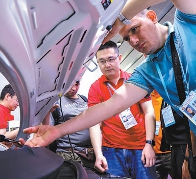 一名外國(guó)采購(gòu)商在第135屆廣交會(huì)新能源汽車展區(qū)詳細(xì)了解一款車型。新華社記者 劉大偉攝