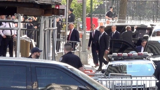 這張4月15日的視頻截圖顯示,美國前總統(tǒng)特朗普抵達紐約曼哈頓一家刑事法院出庭,出席關(guān)于其在2016年涉嫌偽造商業(yè)記錄以掩蓋向一名女演員支付“封口費”一案的審理。新華社記者丁曄攝