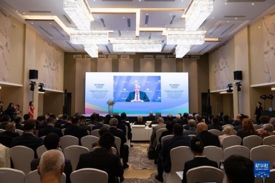 9月23日,在俄羅斯首都莫斯科,俄羅斯國家杜馬第一副主席、俄中友好協會主席伊萬·梅利尼科夫在論壇上發(fā)表視頻講話。新華社記者 白雪騏 攝