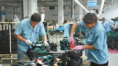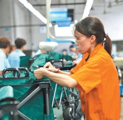 河南泰普森公司生產(chǎn)車間的工作人員正在組裝戶外小拉車。這批訂單將于10月發(fā)往美洲市場。本報(bào)記者 張文豪攝