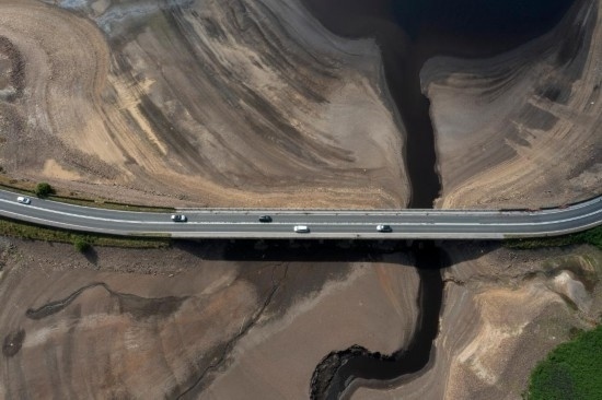 這是2022年7月19日在英國曼徹斯特附近拍攝的幾近干涸的伍德黑德水庫(無人機(jī)拍攝)。新華社發(fā)(喬恩·休珀攝)