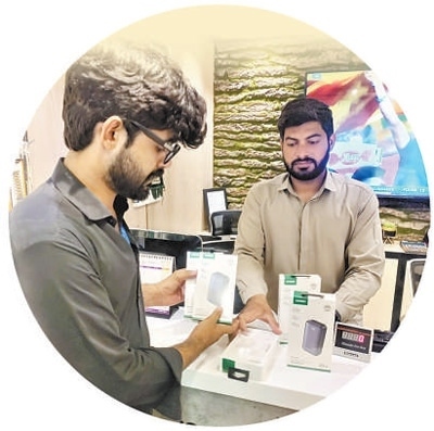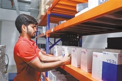 中國(guó)企業(yè)位于巴基斯坦的海外倉(cāng)將中國(guó)制造的數(shù)碼產(chǎn)品等高附加值貨物快速配送至本地線下零售商網(wǎng)絡(luò),顯著提升效率和靈活性。圖為海外倉(cāng)的送貨員正在與當(dāng)?shù)厣虘艚唤迂浳铩1緢?bào)巴基斯坦分社 賽義德·邁赫迪攝