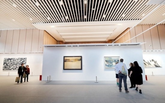 11月9日,觀眾在第七屆進(jìn)博會(huì)國(guó)際現(xiàn)當(dāng)代藝術(shù)專區(qū)觀看繪畫(huà)藝術(shù)展品。新華社記者 方喆 攝