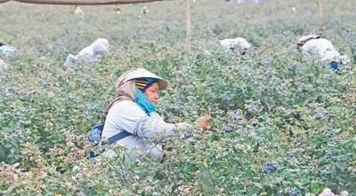 秘魯特魯希略市一家農(nóng)場(chǎng)內(nèi),工人們?cè)诓烧{(lán)莓。本報(bào)記者 顏 歡攝