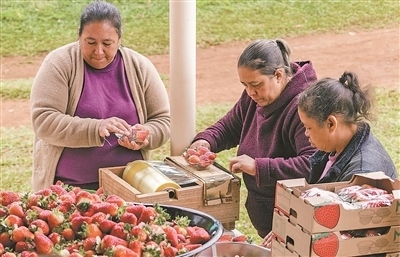中國(guó)三峽巴西公司在位于巴西南部格利保吉水電站周邊開(kāi)展創(chuàng)收創(chuàng)業(yè)試點(diǎn)項(xiàng)目。圖為當(dāng)?shù)剞r(nóng)戶(hù)正在分裝草莓。納塔利婭·弗洛爾攝