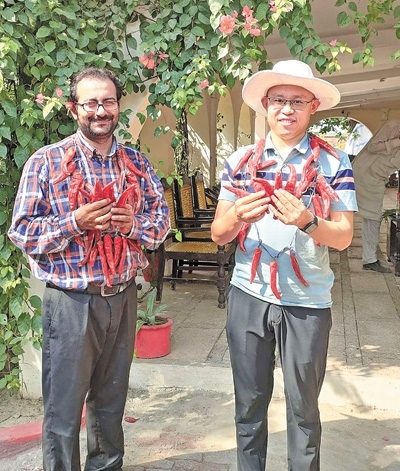 參與中國(guó)—巴基斯坦辣椒種植合作項(xiàng)目的中國(guó)專(zhuān)家與當(dāng)?shù)丶夹g(shù)員共同慶祝辣椒豐收。本報(bào)巴基斯坦分社 瓦卡斯·阿赫邁德攝