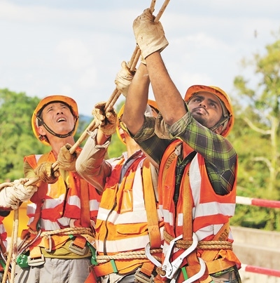 東海岸鐵路項(xiàng)目工人在進(jìn)行中T梁架設(shè)。