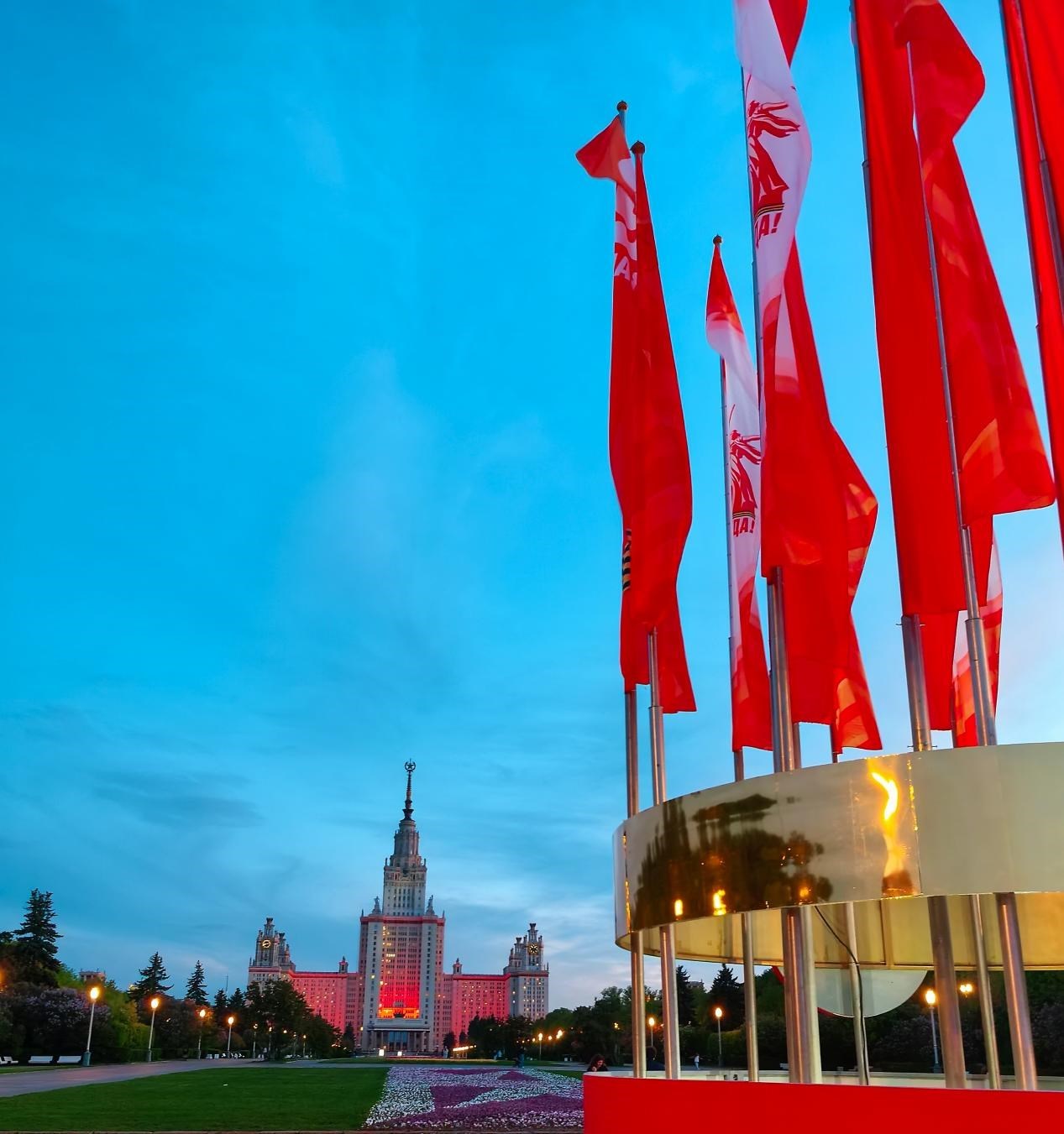 當(dāng)?shù)貢r(shí)間5月6日,莫斯科麻雀山,紀(jì)念蘇聯(lián)偉大衛(wèi)國(guó)戰(zhàn)爭(zhēng)勝利80周年慶典的旗幟飄揚(yáng),與莫斯科國(guó)立大學(xué)主樓的燈火遙相輝映。 鄺西曦 攝