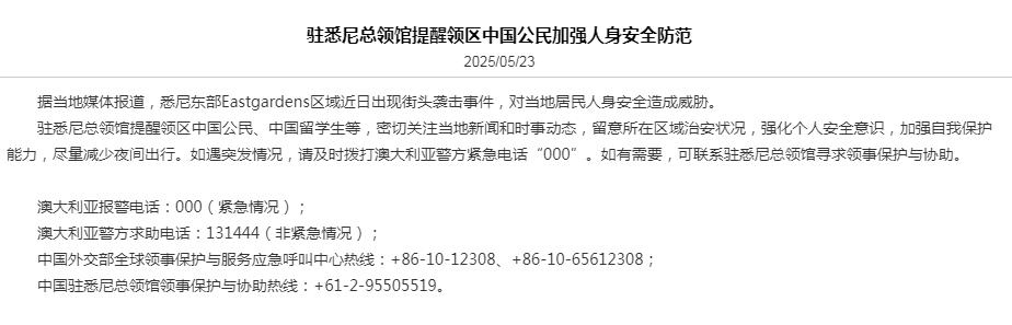 新華社悉尼5月23日電 中國駐悉尼總領(lǐng)館23日連續(xù)發(fā)布兩條提醒,提醒領(lǐng)區(qū)中國公民加強人身安全防范。