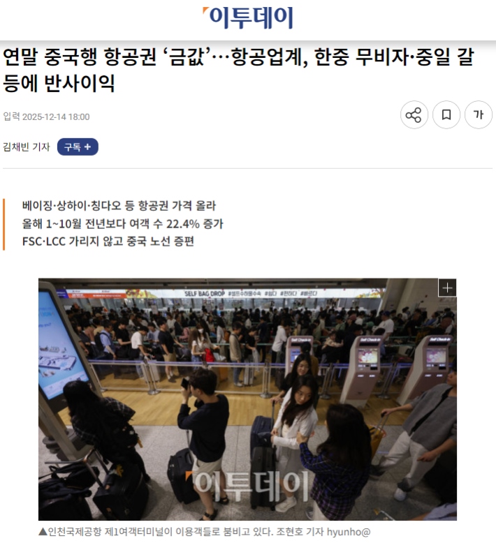 市場旺盛的需求直接傳導至價格層面。韓國《Etoday》近日一篇題為《年底飛往中國的航班“如同黃金般珍貴”》的報道,生動描繪了當前中韓航線的熱度。報道指出,截至12月中旬,韓國飛往北京、上海、青島等主要中國城市的機票價格大幅上漲。例如,大韓航空執(zhí)飛的首爾-上海往返票價已漲至約40萬韓元,濟州航空的韓元-青島航線往返票價也接近30萬韓元。業(yè)內分析指出,即便考慮季節(jié)性因素,當前票價仍比去年同期高出約20%。來往中韓“一票難求”,華燈初上的明洞和外灘,熱氣騰騰的烤肉與火鍋,游客們的熱情互動給這個寒冷的冬天帶來暖意。