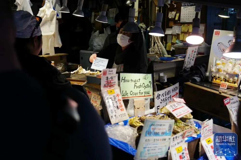 12月18日,在日本東京筑地站附近,一家海鮮店鋪的店員向顧客推銷。新華社記者 賈浩成 攝