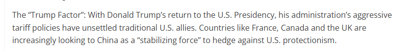 文章說(shuō),美國(guó)政府的強(qiáng)硬關(guān)稅政策令美國(guó)傳統(tǒng)盟友感到不安。法國(guó)、加拿大和英國(guó)等國(guó)家正日益將中國(guó)視為“穩(wěn)定力量”,以對(duì)沖美國(guó)保護(hù)主義帶來(lái)的風(fēng)險(xiǎn)。