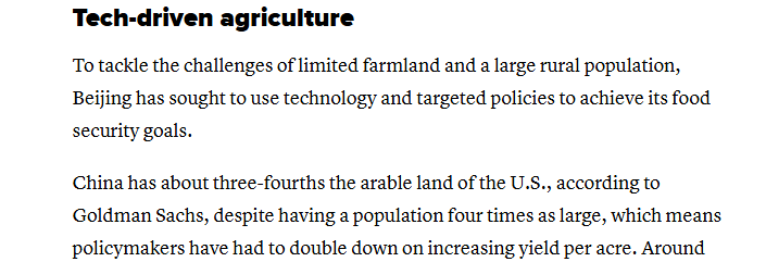 美國消費者新聞與商業(yè)頻道援引高盛集團的數(shù)據(jù)報道稱,中國擁有的耕地面積約為美國的四分之三,但人口是美國的四倍之多,這意味著中國的政策制定者必須加倍努力提高每畝土地的產量。