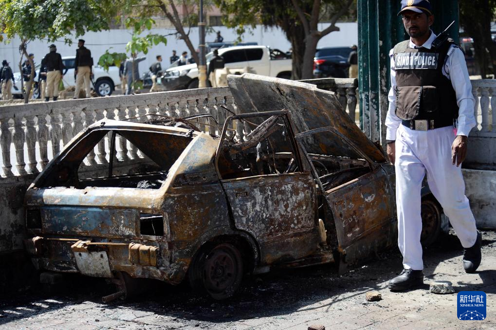3月1日,在巴基斯坦南部城市卡拉奇的美國駐卡拉奇領(lǐng)事館附近,一名警察經(jīng)過被燒毀的車輛。