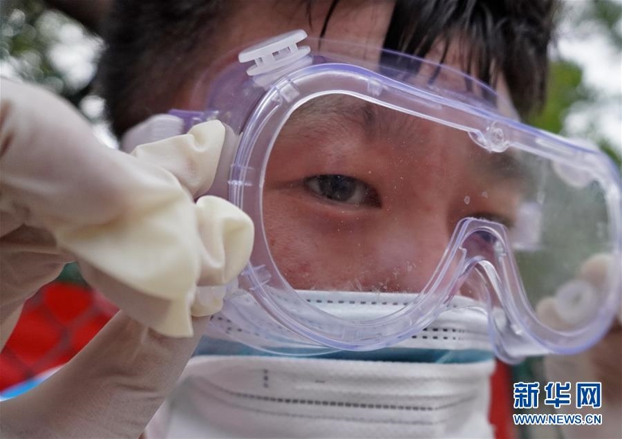 豐臺區(qū)東高地街道社區(qū)衛(wèi)生服務(wù)中心一位醫(yī)護人員的護目鏡內(nèi)流進了汗水(6月15日攝)。連日來,北京出現(xiàn)高溫天氣??崾钪校ぷ魅藛T堅守抗擊疫情一線,成為烈日下的“逆行者”。新華社記者李欣攝