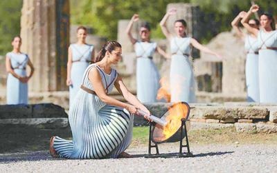 10月18日,北京冬奧會(huì)火種在希臘古奧林匹亞采集成功。圖為扮演最高女祭司的演員點(diǎn)燃火種。新華社記者 鄭煥松攝